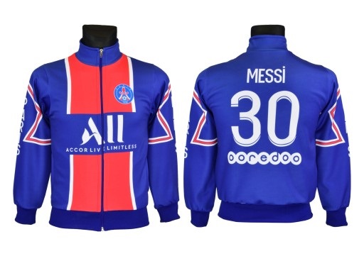Dětská mikina ve stylu repliky PSG Messi 2021/22 v modré barvě určená pro malé Messiho fanoušky. Standardní střih. Materiál: 100% polyester, kovový zip, zateplená vnitřní strana. Na zádech charakteristické číslo 30 a jméno Messi.